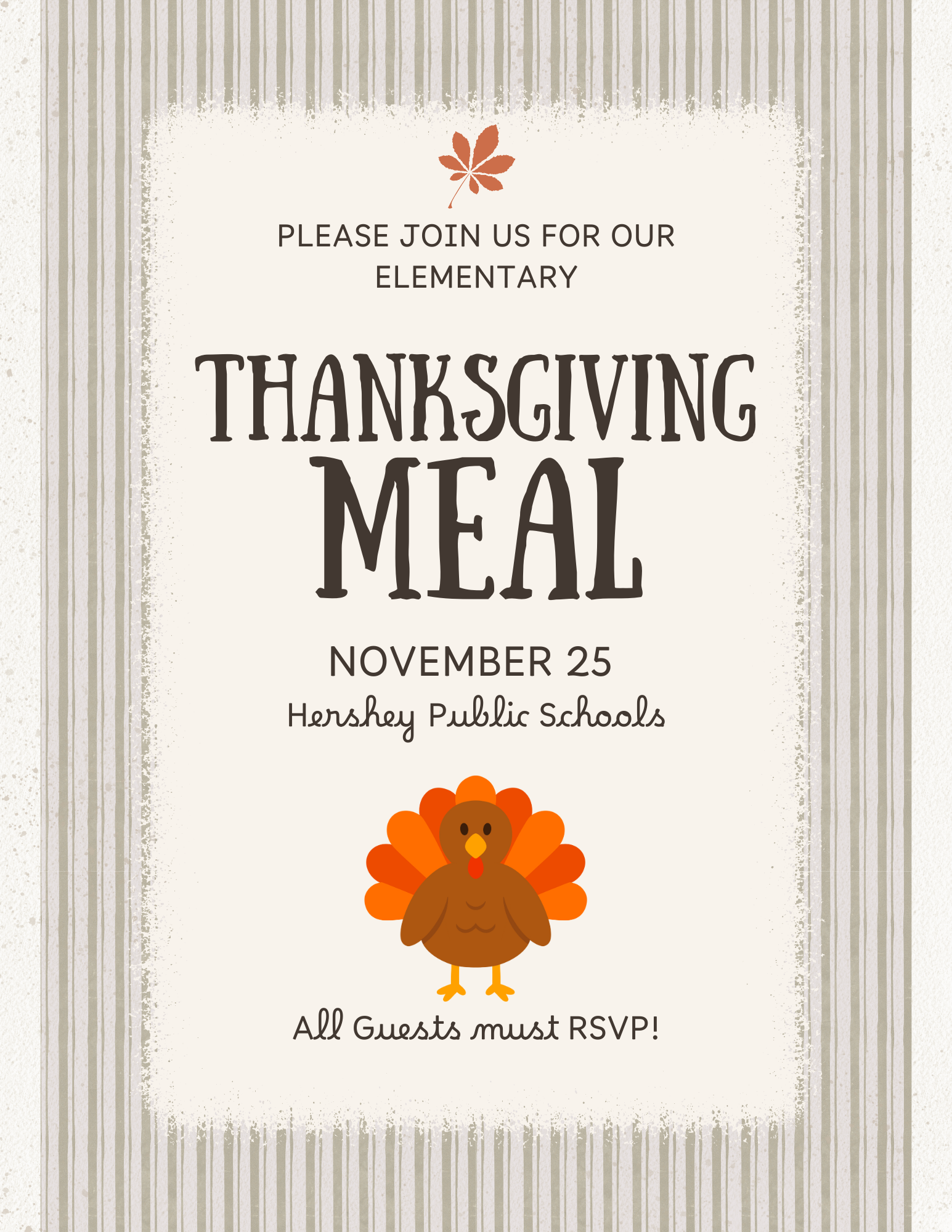 We are excited to invite all families to join us for our Annual Hershey Elementary Thanksgiving Meal on Tuesday, November 25! This special tradition gives students, parents, grandparents, and guardians a chance to share a meal together in celebration of gratitude, family, and community.